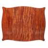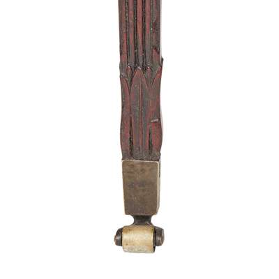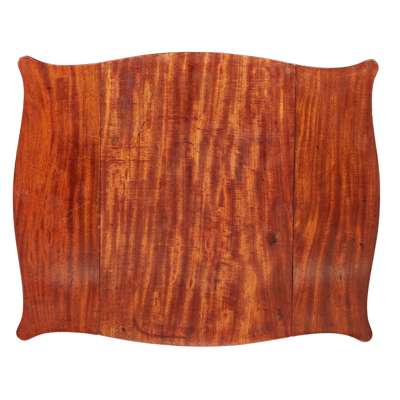 the shaped top with a moulded edge above a serpentine frieze drawer to one end, a dummy drawer opposing, raised on slender reeded square tapered legs headed by inlaid fan medallions and ending in foliate carved feet with brass caps and castors
