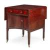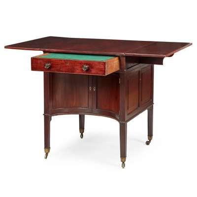 the rectangular top with drop sides above a frieze drawer fitted with a baize slide, over a pair of concave moulded doors opening to a void interior, raised on chamfered square legs ending in brass caps and castors
