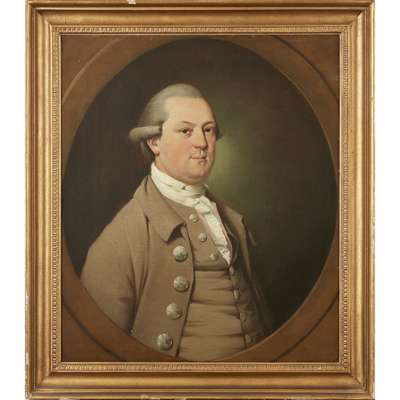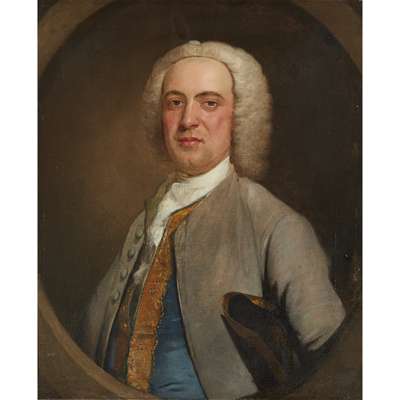 HALF LENGTH PORTRAIT OF A GENTLEMAN IN GREY COAT AND BLUE WAISCOAT