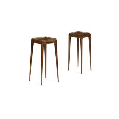 PAIR OF LATE GEORGE III SATINWOOD, BRASS AND STRUNG URN STANDS