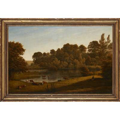 A WOODED LANDSCAPE WITH CATTLE AND FIGURES BY A LAKE