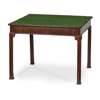 the rectangular fold-over top opening to a green baize surface, opening on double gate legs, above a plain frieze raised on straight square moulded legs with foliate carved brackets