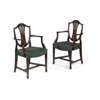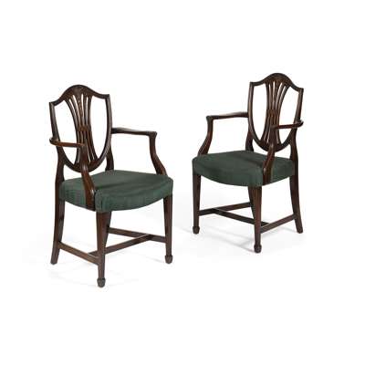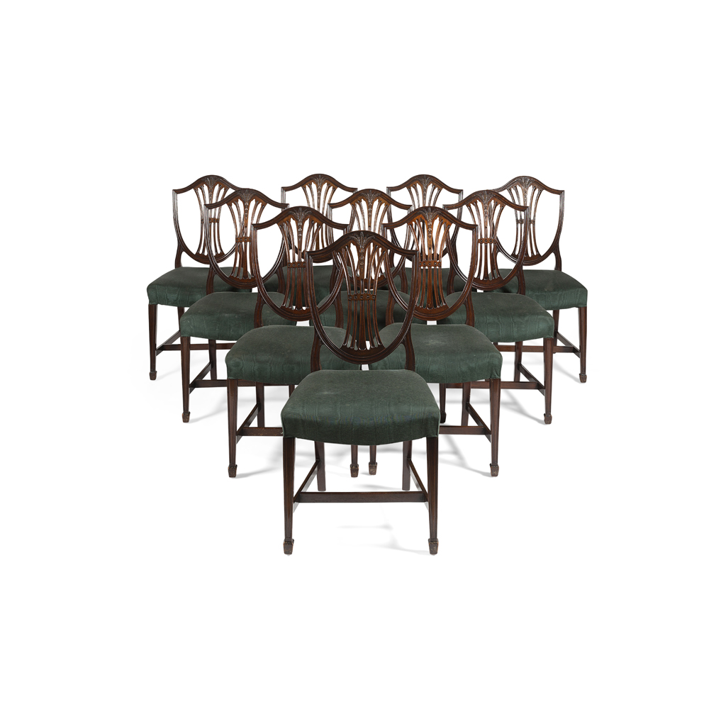 comprising ten side chairs and a pair of armchairs in the Hepplewhite style, the shield backs with pierced splats carved with wheat stalks, above serpentine stuff-over seats raised on channel moulded square tapered legs joined by H stretchers (12)