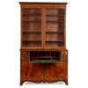 moulded cornice over a pair of glazed doors enclosing shelves; the lower section with a central secretaire drawer with two dummy drawer fronts, opening to a fitted interior, flanked by banks of two short drawers, above a pair of moulded doors enclosing sliding trays and two drawers, over a shaped apron and raised on splay feet