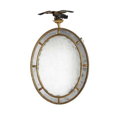 the oval mirror plate in a bead-moulded frame with conforming margin plates, with an eagle cresting