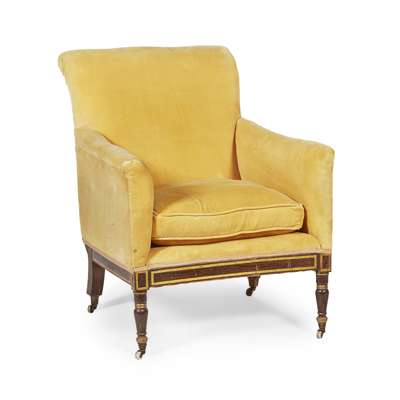 the square scrolled back and arms above a stuff-over seat and grain painted seat rail and turned and tapered legs, in pale yellow plush upholstery