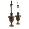 of baluster form with twin ram's head handles, decorated and parcel gilt with classical figures, on square bases, previously wired for electricity (2)