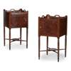 the square tray tops with shaped gallery rails and three cut-out hand holds, above crossbanded drawers, raised on slender turned and tapered legs joined by a cross stretcher and a dished undertier (2)