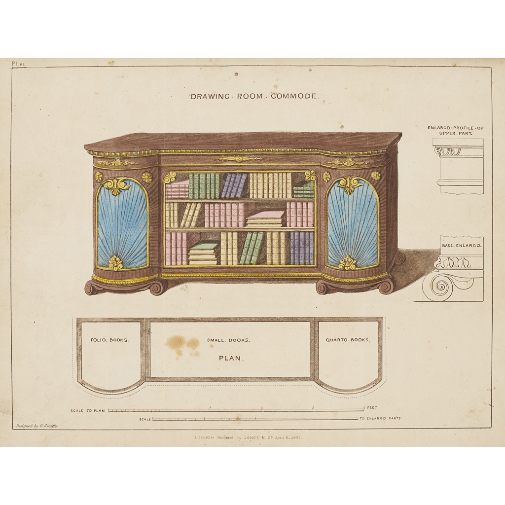 Smith recommended the open-shelved commode for use in the drawing room, although they could be used in 'almost every apartment of a house… for such books are in constant use'. The height of the design was kept deliberately low to allow the wall above to be kept free for paintings or pier mirrors.