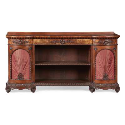 Note: George Smith (1786-1826) published three influential books on design in the first quarter of the 19th century. Smith's A Collection of Designs for Household Furniture and Interior Decoration, published in 1808, was itself influenced by the work of Thomas Hope. Smith's goal was to make Hope's designs accessible to the middle classes, so that 'the beauty and elegance displayed in the fittings-up of modern houses may not be confined to the stately mansion of our Nobility'. He adapted classical motifs borrowed from Egyptian, Greek and Roman sources, but was not averse to adopting Gothic and Chinese elements as well. He followed his first book with A Collection of Ornamental Designs, after the Manner of the Antique, in 1812, and was a regular contributor to Ackermann's Repository. His final publication in 1826, The Cabinet-Maker's and Upholsterer's Guide, included a design for a 'Drawing Room Commode', Plate VI, from which the present lot derives.