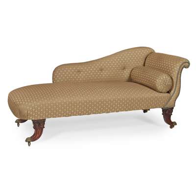 the scroll back and single arm above a long rounded seat with a bolster cushion, raised on grain painted sabre legs carved with palmettes and C scrolls and ending in foliate brass caps and castors; in green and gold pattern upholstery