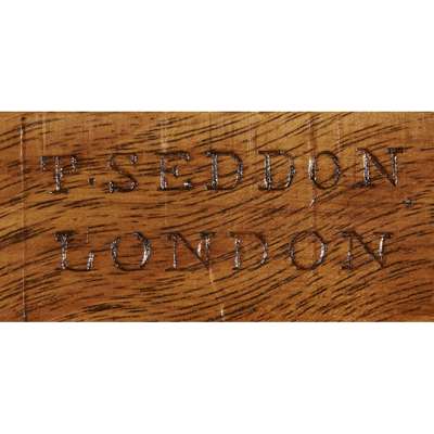 the rounded rectangular top with line inlay above a pair of short frieze drawers, raised on ring turned slender baluster supports on arched trestle bases ending in brass caps and castors and joined by a turned stretcher rail, the drawer stamped T. SEDDON/ LONDON