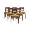 comprising six side chairs and a pair of side chairs, the reeded top rails above pierced splats with ball spacers, above stuff-over seats in yellow plush covers, raised on turned and tapered legs (8)