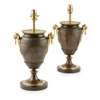 of urn form, moulded with a frieze of scrolling foliate motifs, the handles with leopard heads, raised on ebonised bases, with pleated shades (2)
