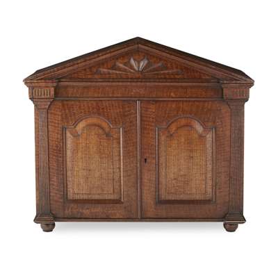 in the form of a Palladian villa, the moulded pediment with a fan carved frieze above arched panel doors flanked by flattened pilasters, opening to a single shelf interior, raised on bun feet