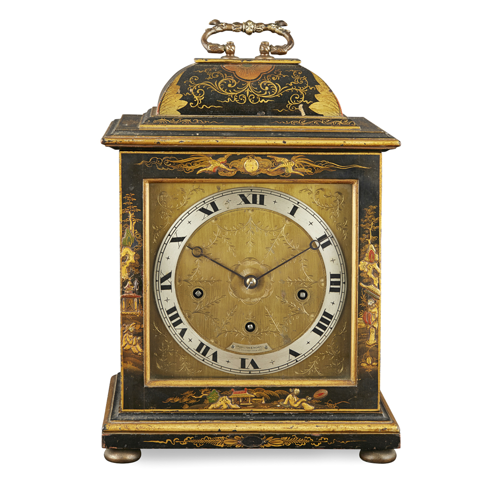 BLACK JAPANNED CHIMING BRACKET CLOCK, RETAILED BY HAMILTON & INCHES