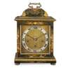 with a brass handle and cushion top above an engraved square brass dial with a silvered Roman numeral chapter ring and retailer's plaque, decorated with Chinese figures, birds and flowers highlighted with gilt details, the eight day movement with a platform lever escapement with a gong strike and chiming on four gongs