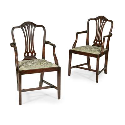 comprising eight side chairs and a pair of armchairs, the shaped top rails above waisted pierced splats and drop-in seats, raised on square tapered legs joined by H stretchers (10)