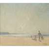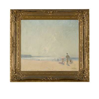 The Silver Light of Summer Morn is a fine example of Gruner's dedication to plein-air painting, in which we're presented with his new, excited and liberal working of the brush. A vast turquoise sky extends across most of the composition, subsuming a mellow swathe of sand, and a delicate slither of seawater disappears into the bright horizon. Rougher topology in the distance smoothly tapers down to a low vanishing point, convening with the lighter tones of the water's surface. We are not, however, the only admirers of this placid view. To the bottom right two women regard the calm waters with their backs to the viewer, one leisurely reclining beneath a pink parasol, the other standing. A deckchair endorses this site as one frequently revered by visitors, accentuated by more distant figures merrily testing the waters of the calm Pacific Ocean.