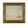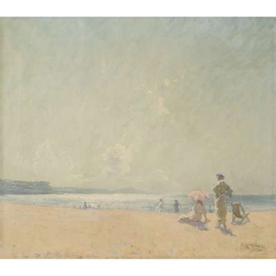 Nonetheless, we're still drawn to the sprawling sky that dwarfs all the participants in this blissful scene - Gruner's affirmation of the landscape as the most important facet of this masterful work. The atmosphere is palpable; long shadows allude to the early time of day - a raw light often favoured by Gruner. The painting evokes a certain ephemerality, as if the tide will soon rise, consuming the lowly swathe of sand; the seated woman will surely raise and fold her parasol, continuing with the nearby figure for an amble along the beach. The solitary deckchair will not remain on the sand forever, and the light will change as the day progresses.