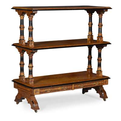 with three tiers raised and divided by turned and part-ebonised supports on flower-head carved blocks, the base with two drawers, raised on arched trestle bases with ceramic castors