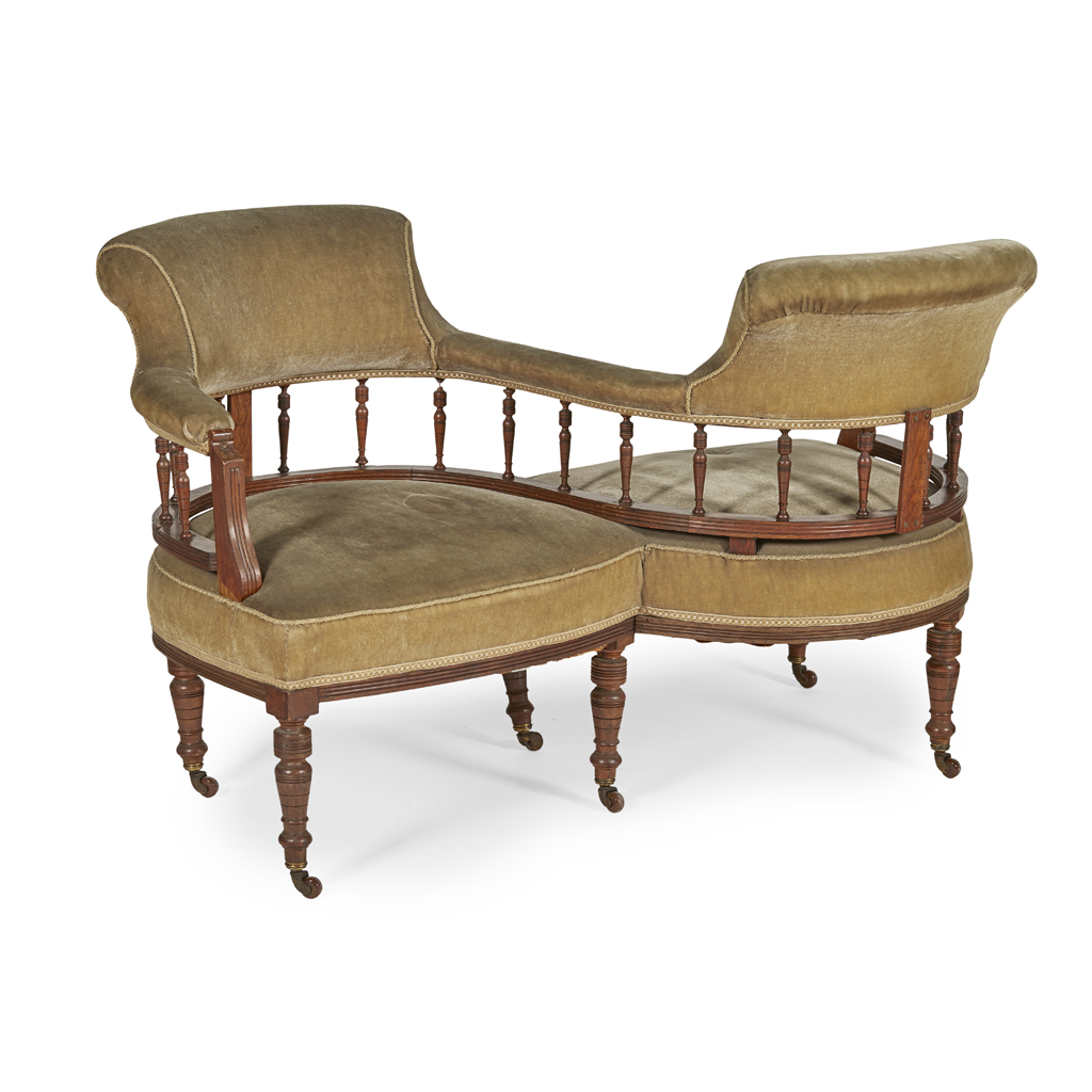 comprising two opposing horseshoe shaped seats with spindle galleries and curved backrests, covered in green plush upholstery, raised on turned legs with ceramic castors