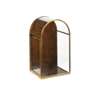 the glazed arched top above an arched door and glazed side panels in a mahogany and brass frame, the hinged side panel opening to void interior