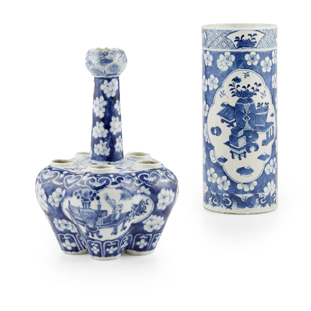 comprising a tulip vase with five lobed wells, decorated with precious objects and prunus, 25cm high; and a sleeve vase similarly decorated, with a Kangxi four character mark, but later, 26cm high (2)