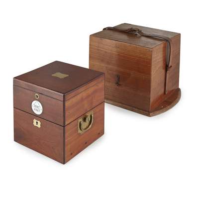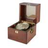 the 3 1/2 inch silvered Roman numeral dial with subsidiary seconds and wind dials, in a brass gimbal and three part mahogany case with glass panel and paper label to the cover, with a white enamel plaque to the exterior; with an outer blue baize lined mahogany case with leather strap closure