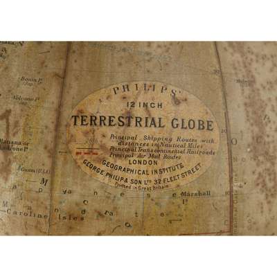 with twelve gores and makers cartouche 'Principal Shipping Routes with distances in Nautical Miles/ Principal Transcontinental Railroads/ Principal Air Mail Routes/ LONDON/ GEOGRAPHICAL INSTITUTE/ GEORGE PHILIP & SON LTD 32 FLEET STREET', on a turned mahogany support and triform base