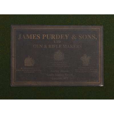 the rectangular case with a circular recessed brass handle and brass hook closures, opening to a partitioned green baize-lined interior, with paper trade label JAMES PURDEY & SONS