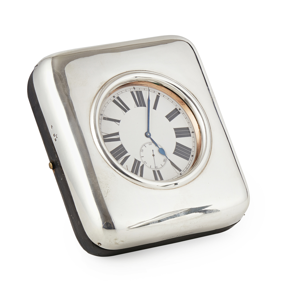 the hinged silver case hallmarked with rubbed maker's marks for William Comyns, opening to a velvet-lined interior and a clock in the form of a Goliath pocket watch with white enamel Roman numeral dial, with black leather backing and easel support