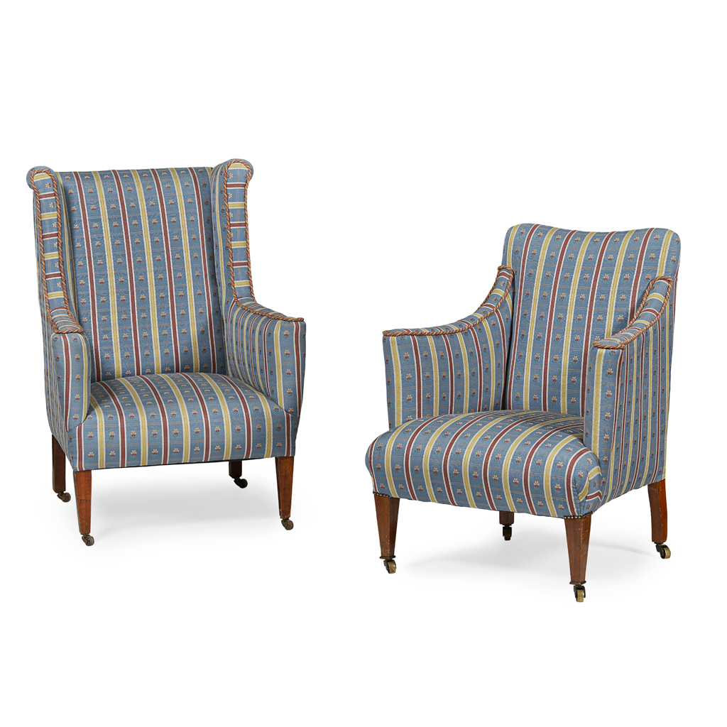 in matching blue stripe upholstery with braid trimming, the first a wing armchair with outscrolled arms and square tapered legs with ceramic castors, 108cm high; the other with a low back and outscrolled arms, on square tapered legs with brass castors, 70cm high (2)