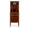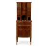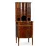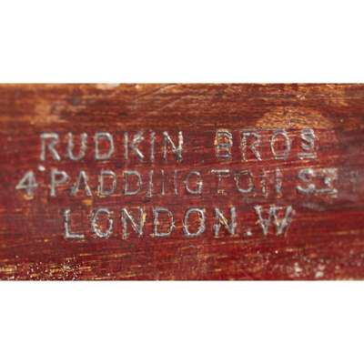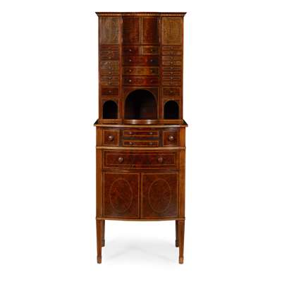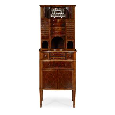 the superstructure with a central cupboard fitted with an assortment of glass apothecary bottles, above two short and three long bowed drawers, flanked by cupboards and drawers; the lower part with and arrangement of drawers, cupboards and shelves, raised on square tapered legs with spade feet, with ivorine label RUDKIN BROS/ 4 PADDINGTON ST/ LONDON W