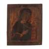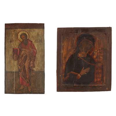 polychrome painted, depicted standing dressed in red and brown robes, a Bible in his right hand; together with a RUSSIAN ICON, THE MOTHER OF GOD, 18th Century, Mary shown half-length holding a scroll in her left hand, within a recessed panel, probably from a Deisis, 28.5cm x 24cm (2)