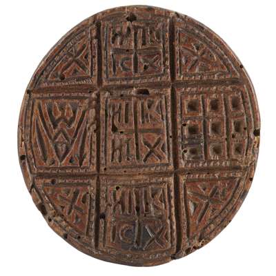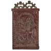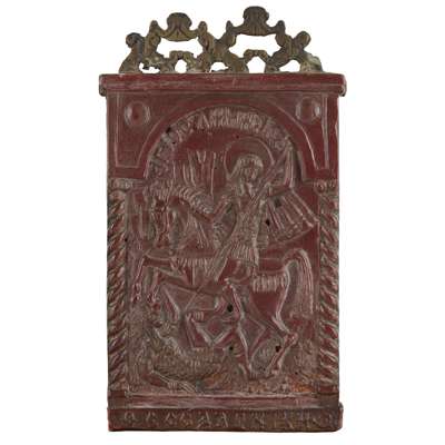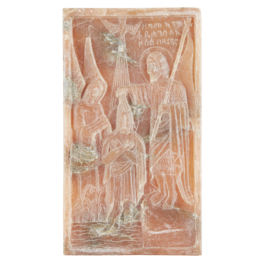 of similar design, the figure of Christ flanked by saints and surmounted by the Mandylion, both recess-mounted in modern ebonised frames, 23cm high; together with a RELIEF CARVED ALABASTER PANEL depicting the Baptism of Christ, 31.5cm x 18cm; a CARVED AND PAINTED PANEL of a warrior saint on horseback, 15.5cm x 9cm; an EARLY CHRISTIAN CARVED WOOD SEAL, probably Greek, 9cm high; and an EARLY CHRISTIAN POTTERY OIL LAMP, 13cm long (6)