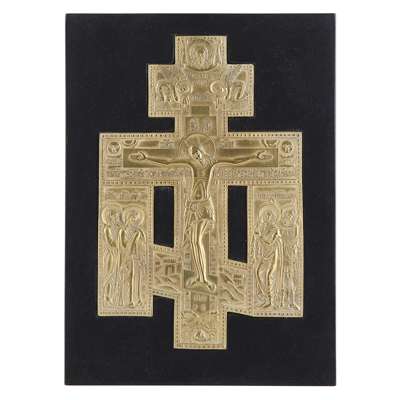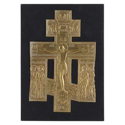 TWO RUSSIAN RELIEF CAST BRASS CRUCIFIXES