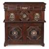 the moulded rectangular top above a long frieze drawer and deep drawer with a central octagonal panel flanked by arched panels inlaid with flowerheads and geometric motifs; the separate base with a pair of moulded doors with further octagonal inlaid panels opening to three long drawers, raised on stile feet