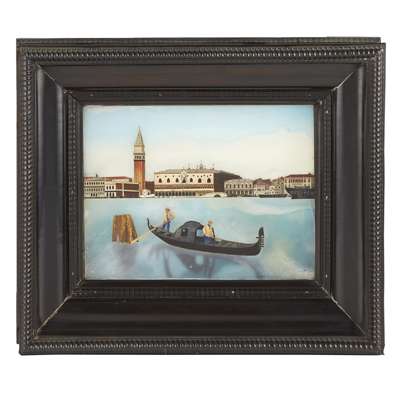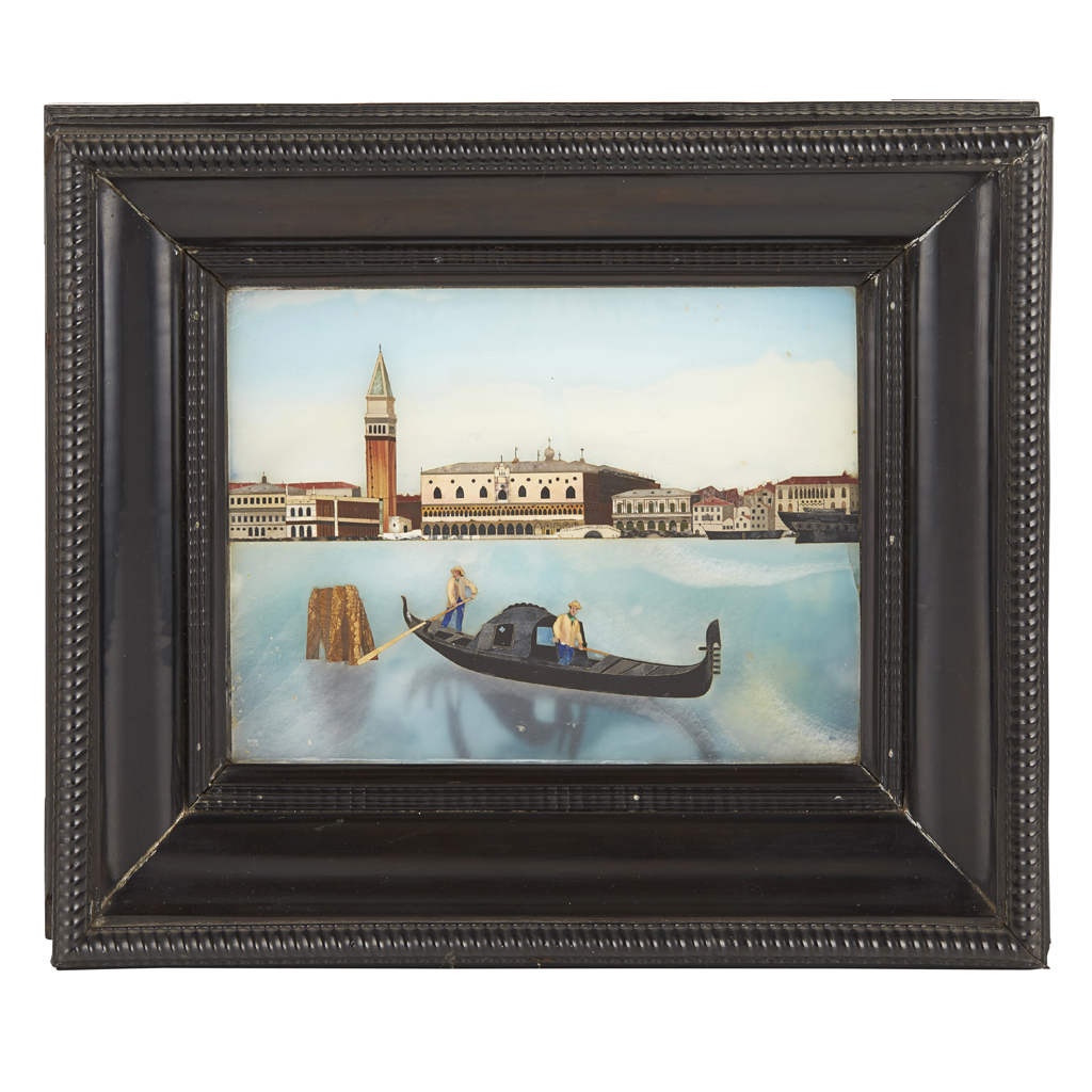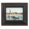 depicting a Venetian scene, in an ebony ripple cut deep moulded frame