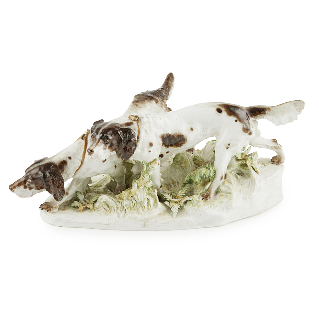 modelled as two hounds on a rocky ground with foliage, signed JARL, with blue crossed swords mark, incised and impressed numbers
