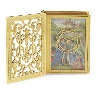 the pierced hinged cover opening to an enamelled panel depicting medieval figures, signed H. BENOIT-GUBELIN, with a pierced gilt chapter ring, the spine engraved LIVRE D'HEURES, the movement cover marked 15 Jewels and serial no. 2845