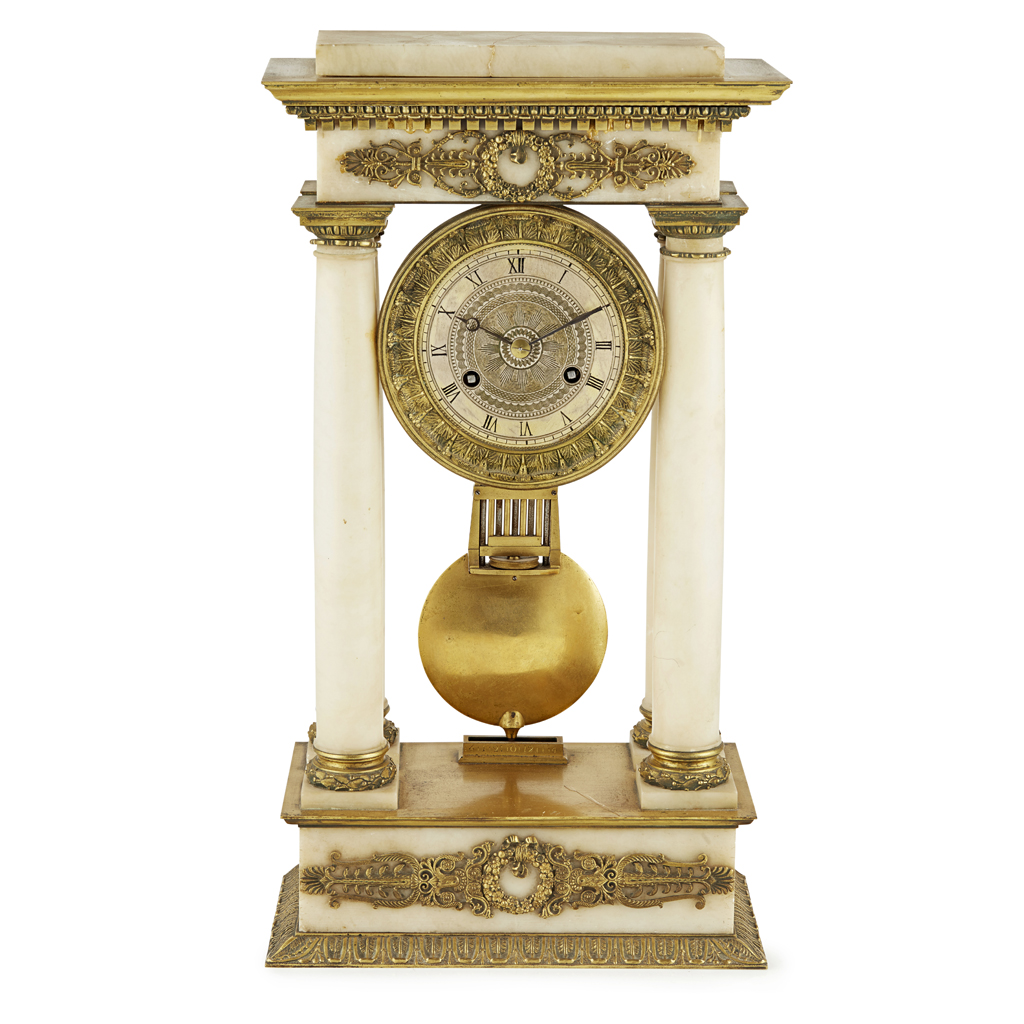 FRENCH EMPIRE WHITE MARBLE AND GILT BRONZE PORTICO CLOCK