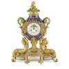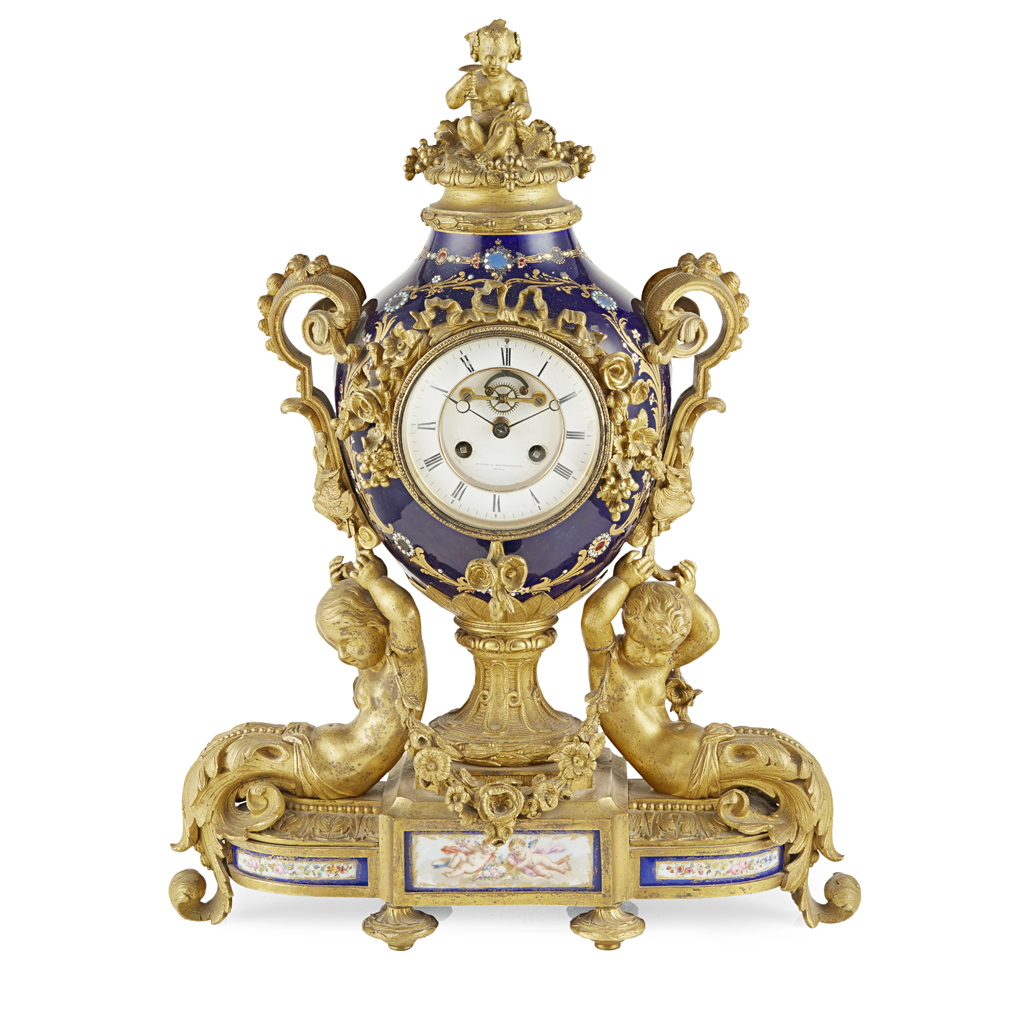 in the Rococo style, the white enamel Roman numeral dial signed AUBERT & KLAFTENBERGER/ GENEVE, in a cobalt blue and enamel decorated baluster body, surmounted by a gilt bronze Bacchic putto finial and mounted scroll handles, supported by a pair of gilt bronze merchildren on a shaped oval base with porcelain plaques, raised on toupie feet, the eight-day movement striking a bell