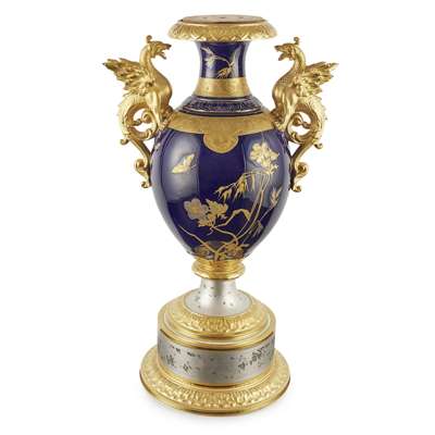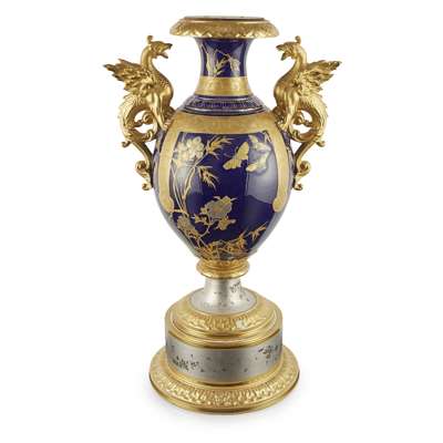 of baluster form with gilt dragon scroll handles, decorated in gilt in low relief with flowers and butterflies on a cobalt ground, raised on a silver glazed socle pedestal base, impressed maker's monogram F&M