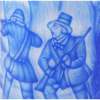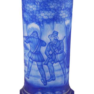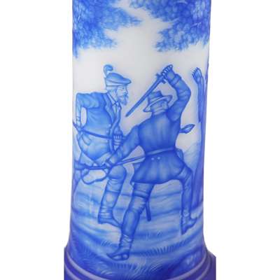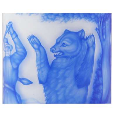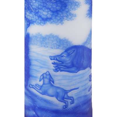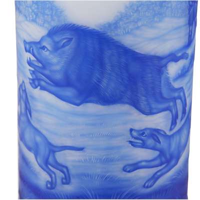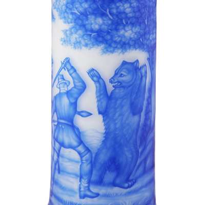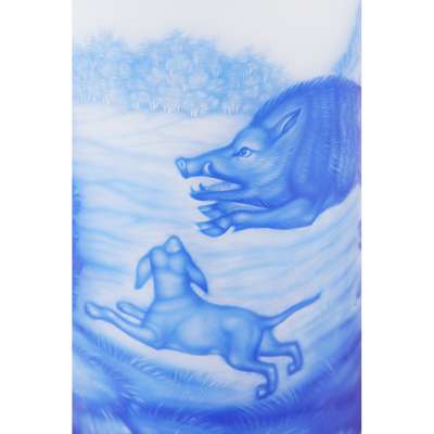 of cylindrical form with flattened bases, depicting hunting scenes of men attacking a bear and a wild boar in blue (2)