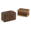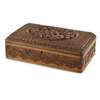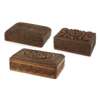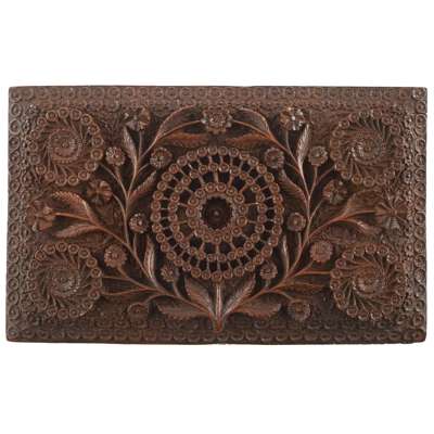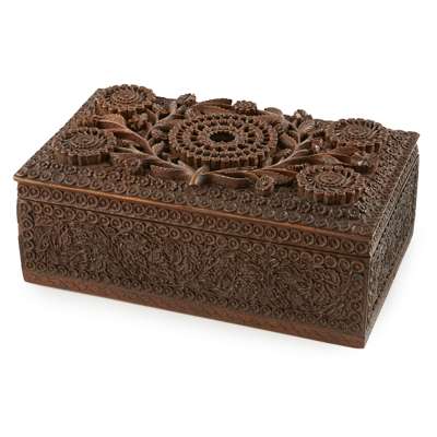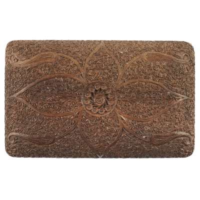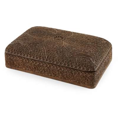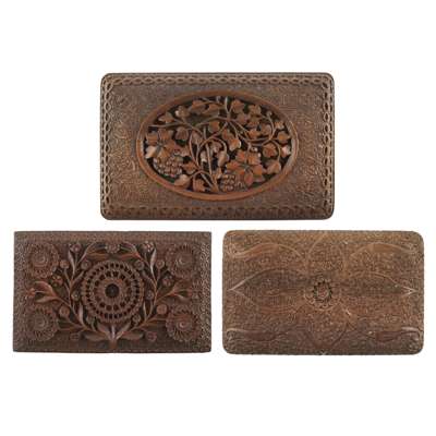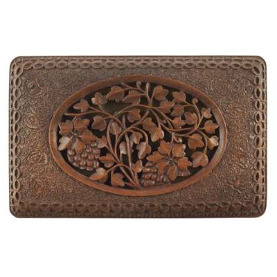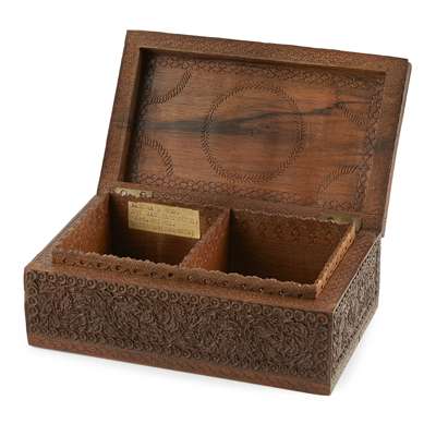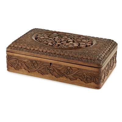 all carved with allover patterns of scrolling vines and flowers, comprising a large rectangular box carved with an oval reserve of fruiting vines, 28cm wide; a box carved in with stylised flower heads and vines, 19.5cm wide; a box carved with stylised flowers and vines, 19cm wide; a cigarette box with three hinged compartments, 15.5cm wide; and another cigarette box with a lift-up cover and cigarette tray, 14cm wide (5)