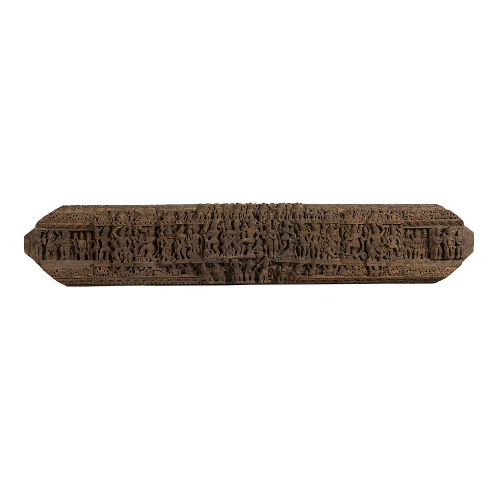 carved in deep relief depicting Shiva freeing Markandeya from the god of death, Yama, the remaining fields filled with a host of mythological figures