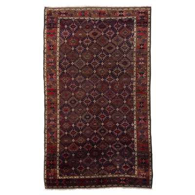 the indigo field with allover stylised rosette lattice pattern, within purple stylised foliate border