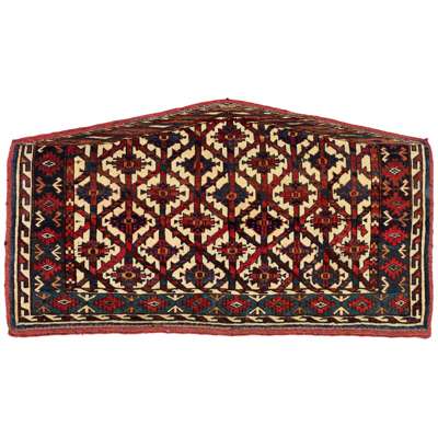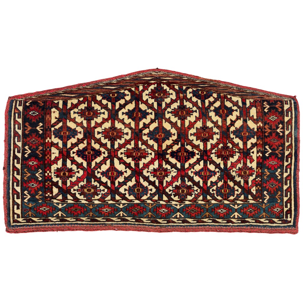 the ivory field with allover lattice pattern, within indigo serrated lozenge border