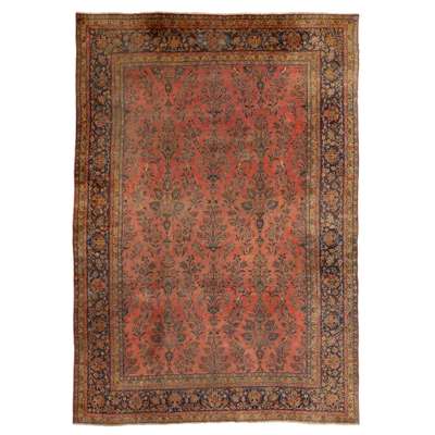 the salmon pink field with allover floral vases and birds on branches pattern, within indigo palmette and foliate vine border